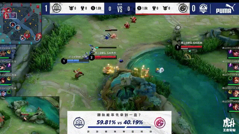 1分钟,GK抱团入侵蓝区,鹏鹏曜反到蓝buff,子阳桑启关键一拍留住敌人,花海娜可露露及时赶到击杀张飞,鹏鹏两端1又击杀小鸟,GK打出1换2小赚