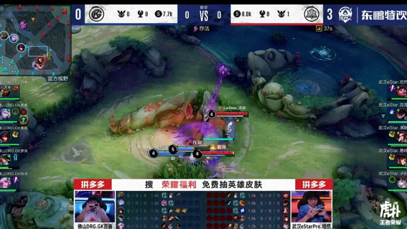 4分58秒,我,最后的防线!鹏鹏铠大招一开魔铠降临直冲es,子阳东皇无奈反咬随后阵亡,双方激烈交火互交技能,GK0换1