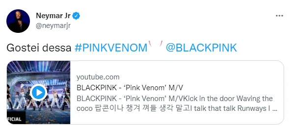 08月20日讯 巴西球星内马尔在自己推特分享了韩国组合BLACKPINK新曲-Pink Venom的MV,并配文“我喜欢这个”。