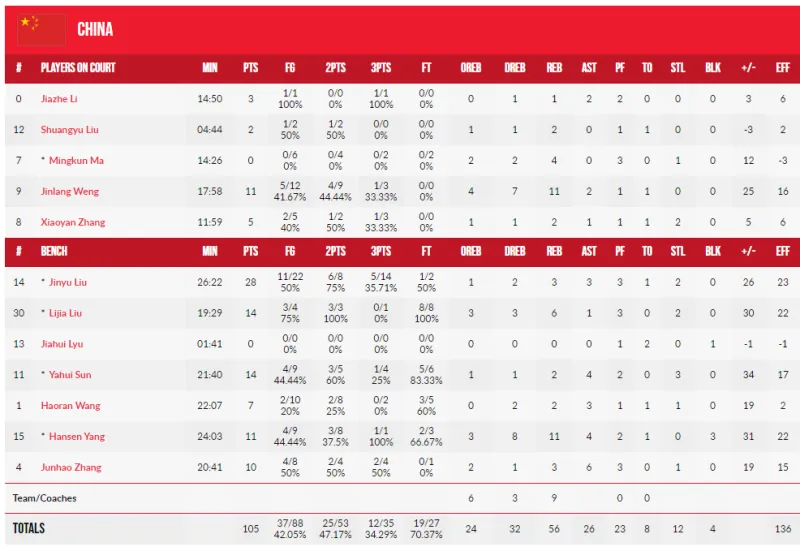 刘金雨28分3篮板3助攻,刘礼嘉14分6篮板,孙亚辉14分4助攻,杨瀚森11分11篮板4助攻3盖帽。