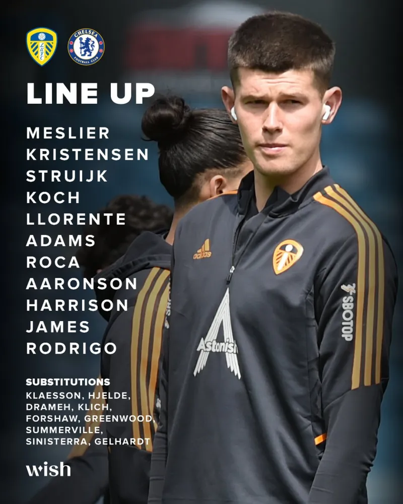 利兹联首发:1-梅斯利耶、5-科赫、14-迭戈-略伦特、21-斯特鲁伊克、25-R-克里斯滕森、7-阿伦森、8-马克-罗卡、11-杰克-哈里森、12-泰勒-亚当斯、20-丹尼尔-詹姆斯、19-罗德里戈