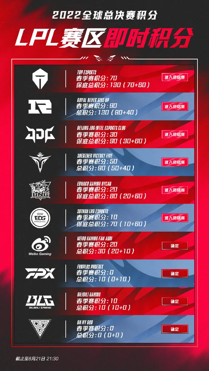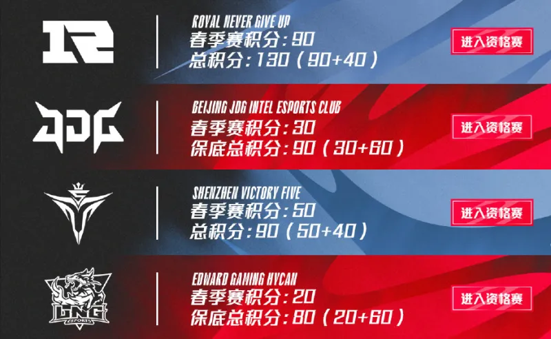 即时积分榜为春季赛积分与夏季赛保底积分的总和,根据队伍当前排名换算夏季赛保底积分。积分相同时,夏季赛积分更高的队伍拥有更高的排名。