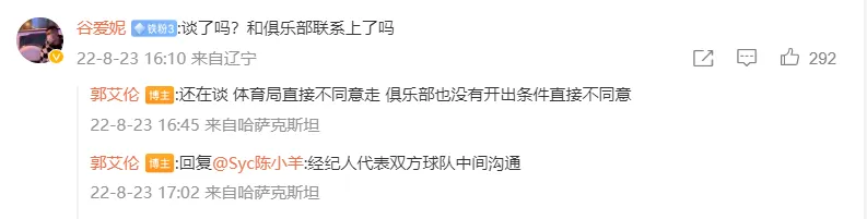 郭艾伦今天下午更博谈及转会一事,有网友问道:“谈了吗?和俱乐部联系上了吗”,他表示:“还在谈。体育局直接不同意走,俱乐部也没有开出条件直接不同意。”