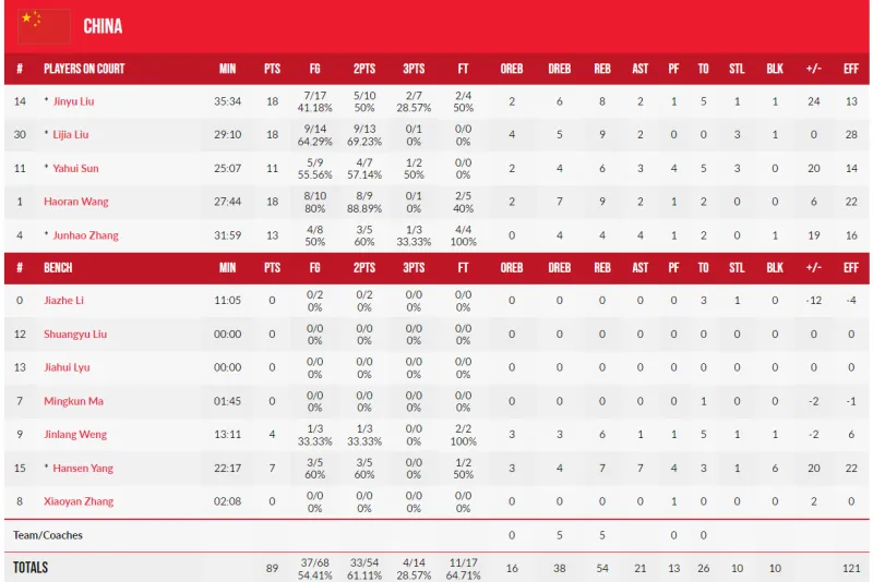 中国队:王浩然18分9篮板2助攻,刘金雨18分8篮板2助攻1抢断1盖帽,刘礼嘉18分9篮板2助攻3抢断,孙亚辉11分6篮板3助攻3抢断,张峻豪13分4篮板4助攻1盖帽,杨瀚森7分7篮板7助攻6盖帽。
