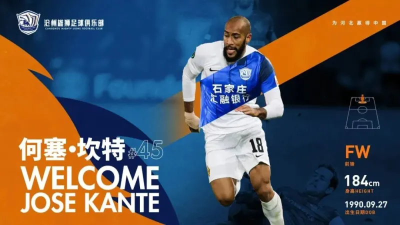 何塞-坎特出生于1990年9月27日,场上司职前锋,拥有几内亚和西班牙双国籍。球员职业生涯曾效力于华沙莱吉亚、海拉提等欧洲知名球队,拥有丰富的欧战经验。2016年,坎特完成了代表几内亚国家队的首秀,至今已有26次国家队出场,收获4粒进球。本赛季坎特代表海拉提在各项赛事中出场13次,斩获6球1助攻,是球队的头号射手。坎特身体素质出众,左右脚能力均衡,拥有良好的策应能力和精湛的射术,在下半年比赛中他将身披雄狮队45号战袍,期待他的到来能够让球队的进攻质量更进一步。欢迎你,坎特!