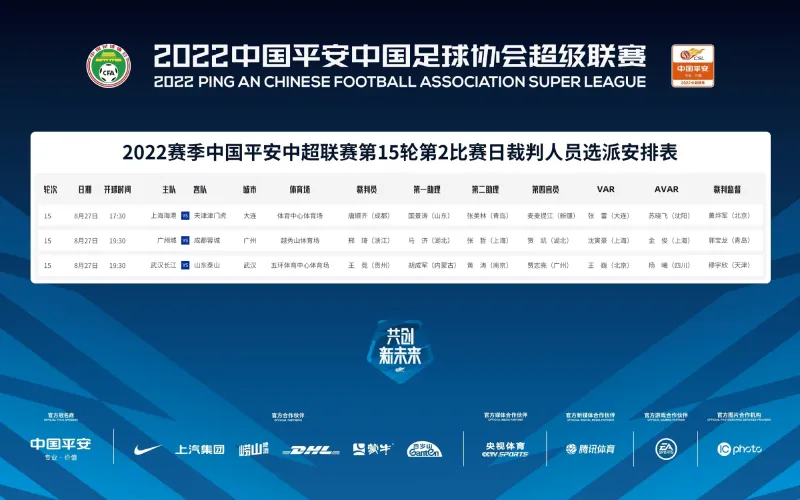 08月27日讯 周六进行的中超第15轮3场比赛,裁判人员选派名单已经公布。
