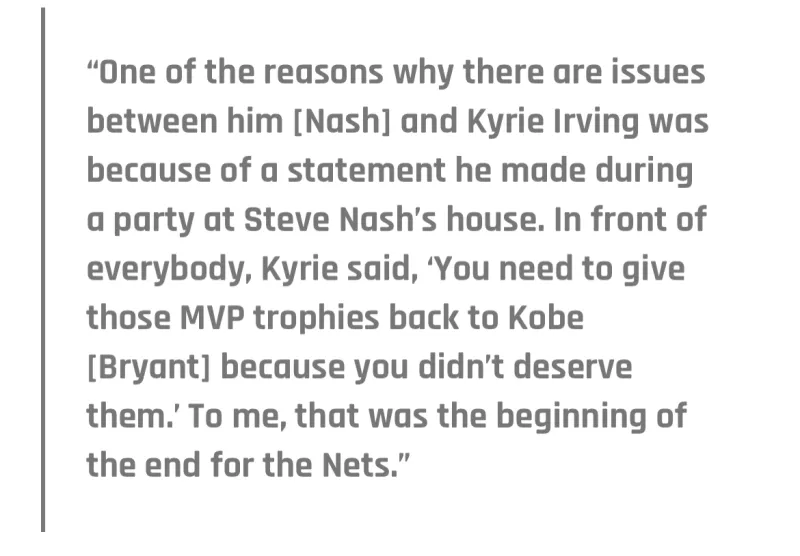 欧文当着大家的面说‘你得把你的那两座MVP还给科比-布莱恩特,你不配拥有(“You Don't Deserve Them.“)。’在我看来,这件事情是篮网后续一系列事情的开端。”