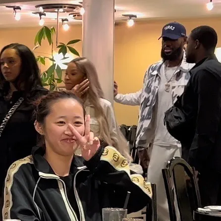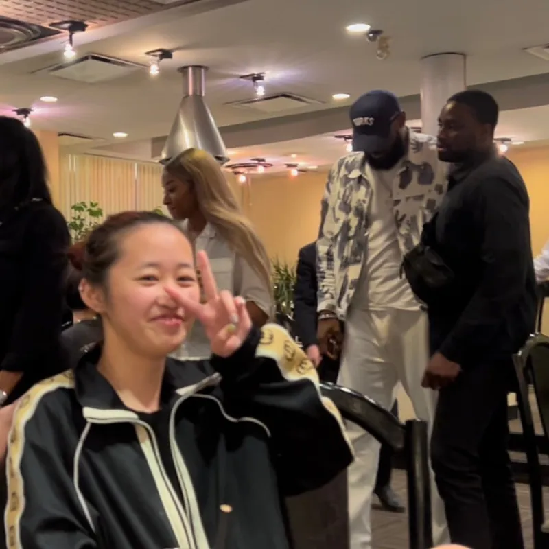 这位华人女网友在詹姆斯经过她身后时主动比出手势让朋友拍照,与詹姆斯完成“合影”。