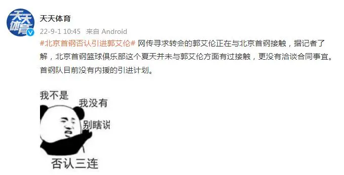 “网传寻求转会的郭艾伦正在与北京首钢接触,据记者了解,北京首钢篮球俱乐部这个夏天并未与郭艾伦方面有过接触,更没有洽谈合同事宜。首钢队目前没有内援的引进计划。”《天天体育》微博写道。