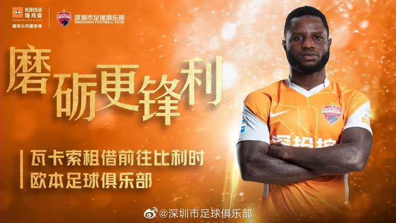 经深圳市足球俱乐部与比利时欧本足球俱乐部及球员本人协商一致,球员穆巴拉克·瓦卡索(Mubarak Wakaso)即日起正式租借至欧本,租期至2023年6月30日。