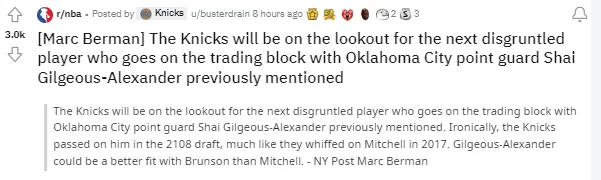 《纽约邮报》的记者Marc Berman在文章中指出,具有讽刺意味的是,尼克斯在2018届选秀中没有选他,就像他们在2017届放弃了米切尔一样。当然,吉尔杰斯-亚历山大可能比米切尔更适配布伦森。