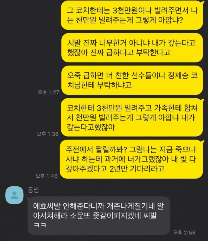部分聊天内容:“Ucal哥哥——你借教练三千万韩元,借我一千万韩元都不肯吗?C8是不是太过分了,我都说了我会还的,真的是很着急才拜托你的啊。我该有多着急才会找你关系亲近的选手和教练啊。你是怕首发位置不保吗?但是现在关系到我是生还是死呀,以前你不是说过吗,会帮我还债,让我再等两年。