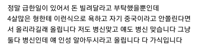 原文内容:“大家好,我是Ucal亲哥哥,我要揭发Ucal。我是真的有急事才像他借钱,结果他就一直骂比自己大四岁的哥哥,说自己在中国不怕丢脸,让我就上传文章,我就上传了。虽然我确实是窝囊废,但他也是窝囊废,我们都是窝囊废,为了让大家知道他的人性我才上传文章的。”
