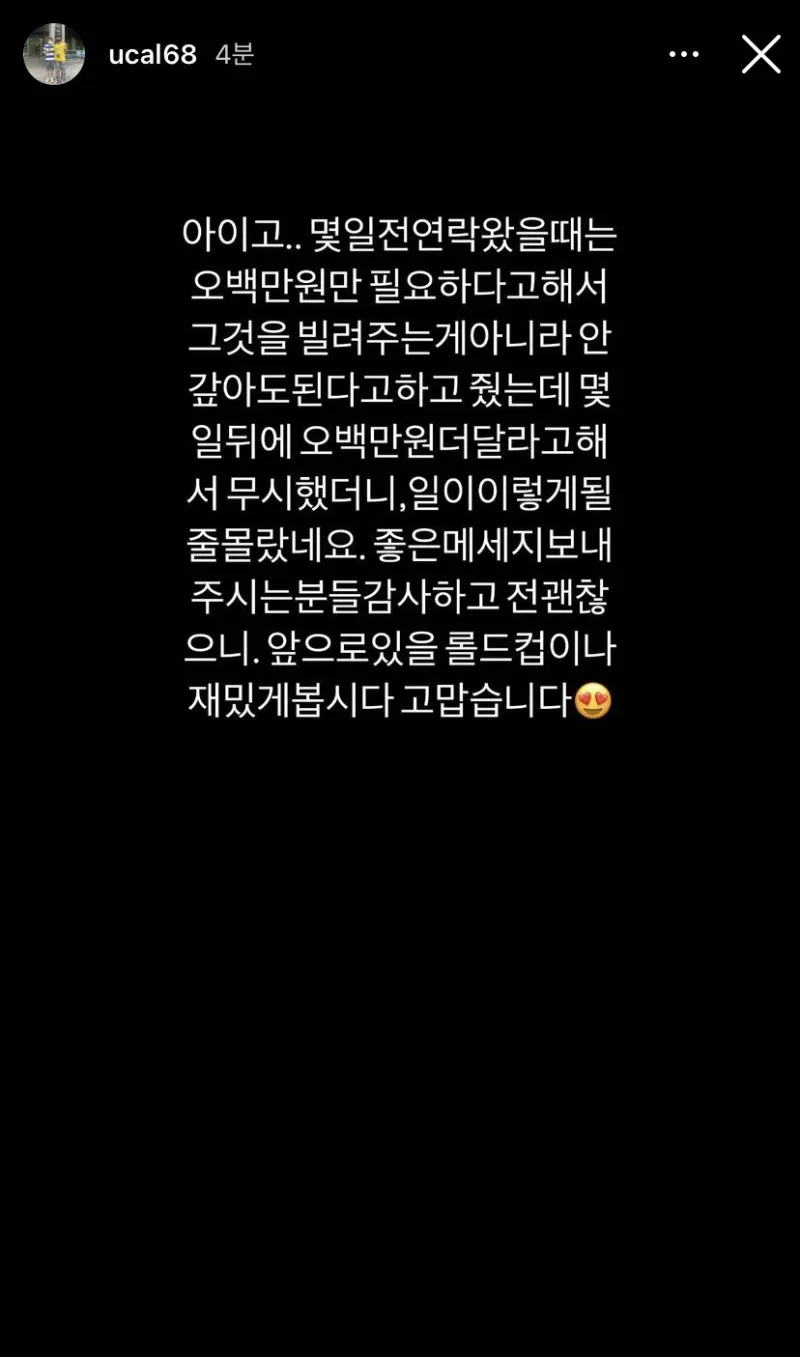“哎,几天前他联系了我,说需要五百万韩币,我就没有借他直接给他了,说不用还了,但是几天之后他又说需要五百万,我就无视他了,没想到事情会变成这样。谢谢大家发消息告诉我,但是没关系的。大家好好享受后面的世界赛吧。谢谢。”