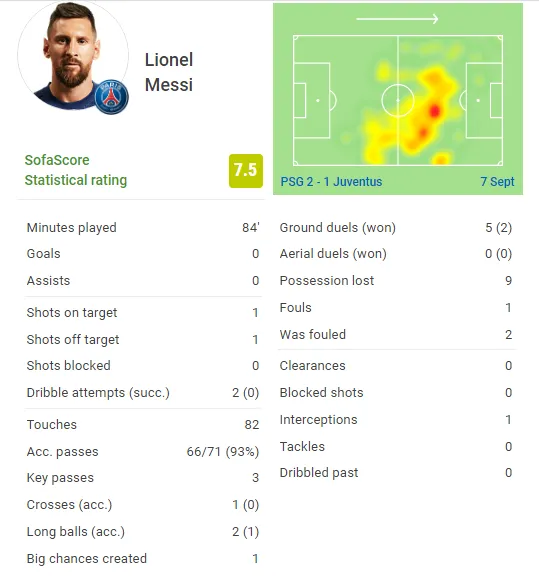 09月07日讯 2022/23赛季欧冠首轮,巴黎圣日耳曼主场2-1战胜尤文图斯,梅西本场数据如下: