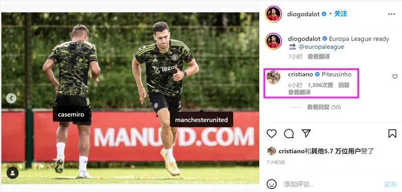 达洛特在Ins上晒出了自己的训练照,并配文写道:“我们为欧联杯比赛做好了准备”。C罗现身评论区评论道:“Piteusinho(比特犬)”