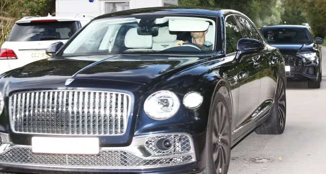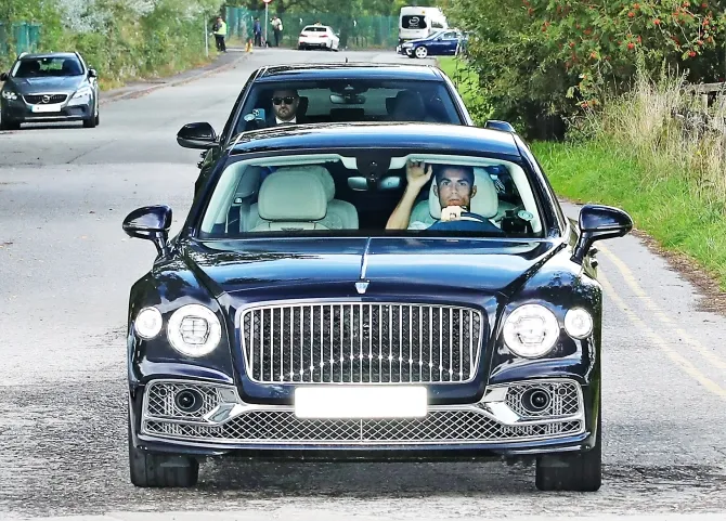 随后不久,葡萄牙球星C罗也亲自驾驶着自己的宾利飞驰来到卡灵顿基地。但他看到记者在拍摄后,便将遮阳板放下。