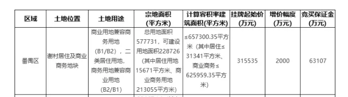 该公告中提及的需满足的出让条件:竞得人须按规划要求配建BA0402042地块(体育用地),BA0402042地块总投资人民币65亿元(其中包括已经建设投资人民币20.92亿元,剩余需继续投资人民币44.08亿元,具体以广州市发展改革委批复的可研报告为准)。项目建成验收合格后须无偿移交给广州市政府指定单位。竞得人须在签订《国有建设用地使用权出让合同》后1个月内与广州市政府指定的单位签订BA0402042地块(体育用地)建设监管协议,否则出让人有权单方面解除出让合同,竞买保证金不予退还。BA0402042地块(体育用地)的建设成本在计算本项目土地增值税、企业所得税前扣除。