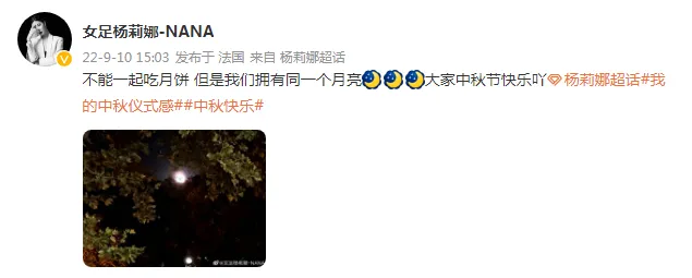 杨莉娜在微博写道:“不能一起吃月饼,但是我们拥有同一个月亮!大家中秋节快乐吖!”