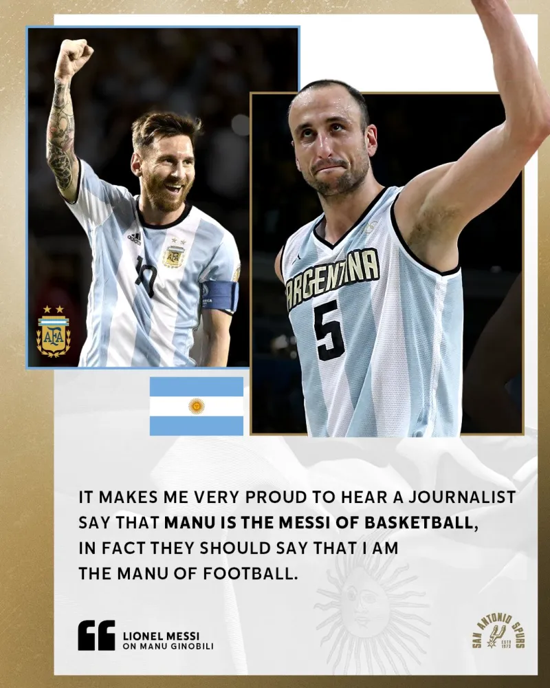 梅西说道:“有记者曾说,马努-吉诺比利是篮坛的梅西,这让我感到很骄傲自豪。但实际上,他们应该说,我是足坛的马诺-吉诺比利。”