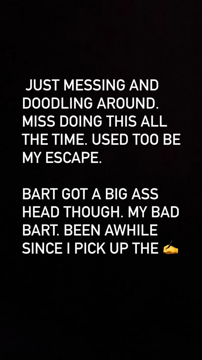 “就是随便涂鸦一番,怀念一直这样画的日子。这曾经是我的逃避方式。不过Bart的脑袋被画得特别大。Bart,这是我的错。我已经有段时间没拿起画笔了。✍️”詹姆斯写道。