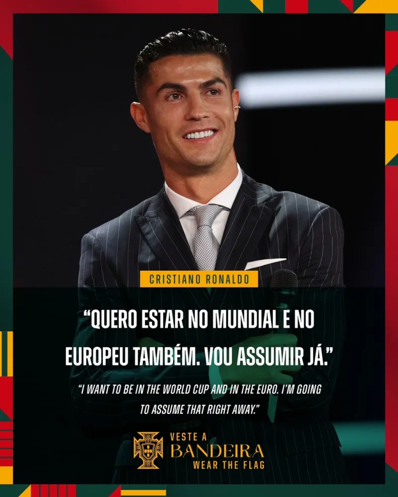谈及自己在国家队的未来时,C罗说道:“我还能继续为国家队征战,我想要参加今年的世界杯,以及2024年的欧洲杯。”