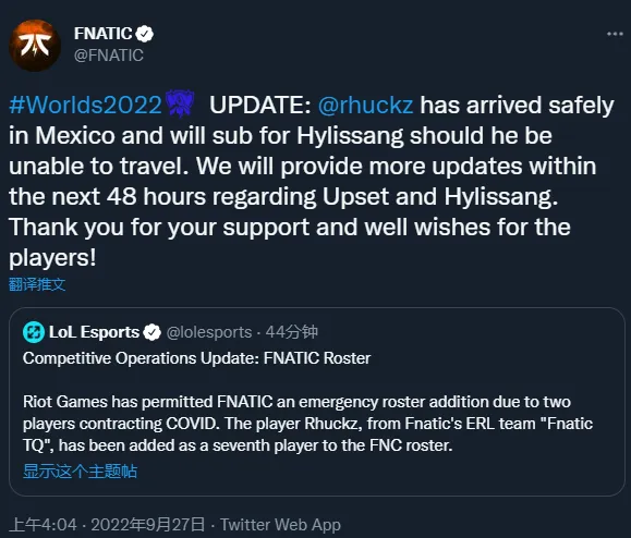 Fnatic战队官方随后发布消息称Rhuckz已经抵达墨西哥。如果Hylissang无法出战,那么他将作为Hylissang的替补登场比赛。接下来Fnatic会在48小时内及时更新Upset和Hylissang的详细情况。
