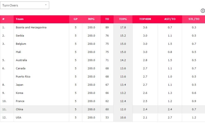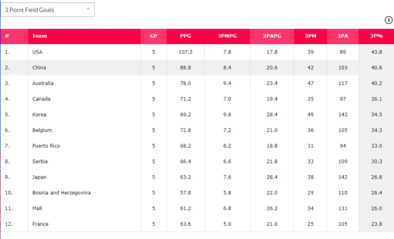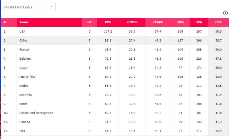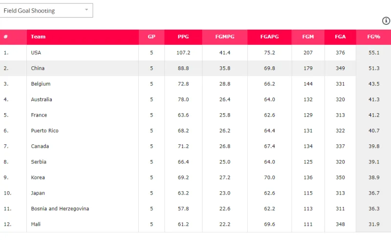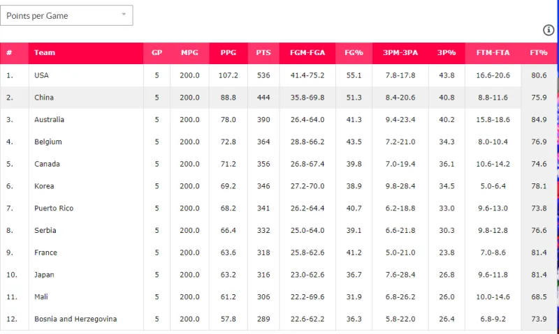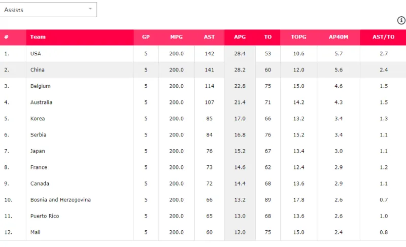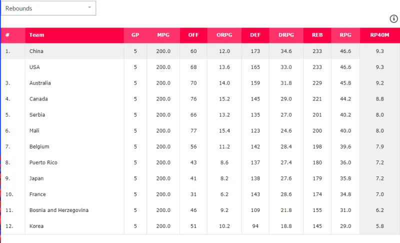 中国女篮场均46.6个篮板,与美国女篮并列第一。场均得分88.8分、场均投篮命中率51.3%、场均2分命中率55.7%、场均3分命中率40.8%、助攻28.2个,以上五项数据仅次于美国,位列第二。除此之外,场均失分57.4分,在所有球队中失分最少。失误数12.0个在所有球队第二少,失误最少的也是美国女篮。