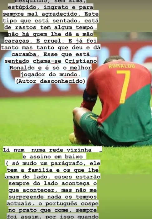 C罗的姐姐在社交媒体中写道:“我认为你必须向一直为葡萄牙建功立业的人伸出援手,因为他们都是伟大的人。但显然葡萄牙人是无知的、小气的、还是没有灵魂的、愚蠢的、更是忘恩负义的,而且也永远都是忘恩负义的人。坐在这里的这个人已经被诋毁了很长一段时间了,但很遗憾却没有人向他伸出援手,该死的,这真的太残忍了,我无法想象这样的情况发生。”
