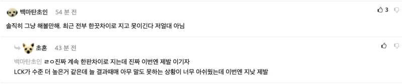 ——回复:是的,几乎都是毫厘之差输掉的,这次拜托赢下来吧,感觉LCK的水平更高,但是因为一直输,所以啥都说不了,非常可惜,这次真的拜托了;