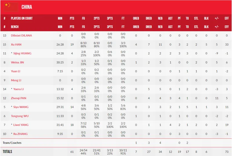 中国女篮数据:韩旭19分11篮板5盖帽;杨力维18分4助攻;王思雨14分;黄思静4分;李月汝4分。