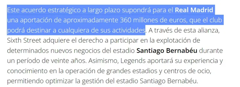 在今年5月,皇马方面宣布与美国投资公司Sixth Street以及美国的体育商业公司Legend就出售伯纳乌球场30%的商业收益权益,以换取3.6亿欧元的投资。