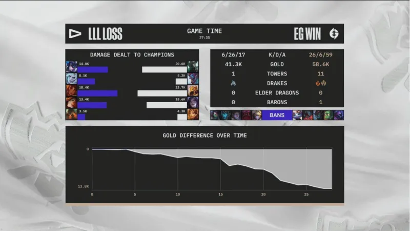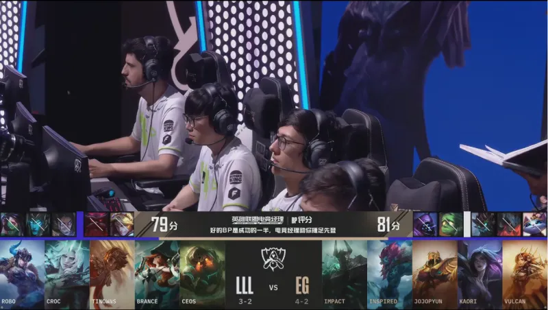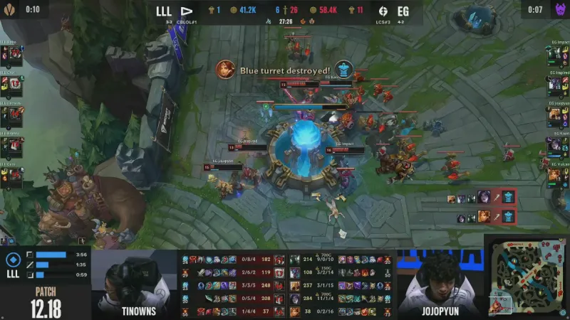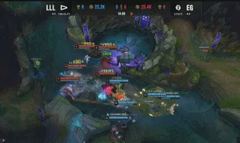 15分钟双方爆发先锋团,Jojopyun沙皇回旋腿分割LLL阵型,EG打出0换2手握5K经济优势;