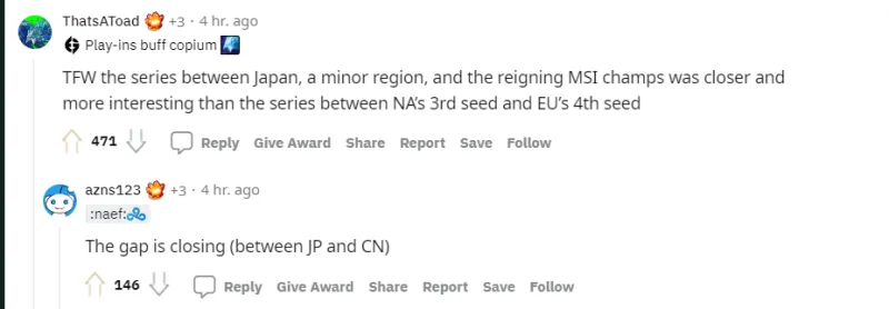 相比于比北美三号种子以及欧洲四号种子之间的比赛,来自外卡赛区的日本队伍碰上MSI的卫冕冠军的比赛差距更小,并且更有意思。