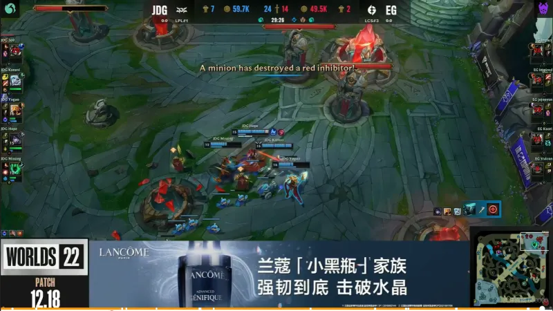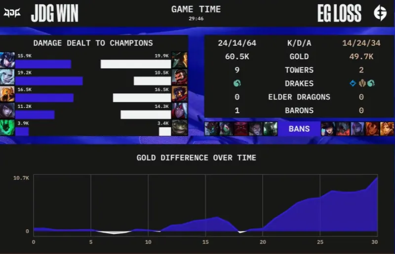 29分钟,EG大龙逼团,JDG完成一波1换5完美团战,高歌猛进一波终结比赛。