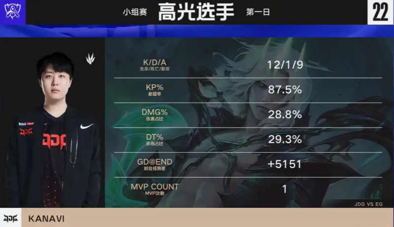 22分钟,韦鲁斯正面团战率先阵亡,破败之王收割残局,JDG完成一波2换5团战,顺势拿下己方第一条小龙。