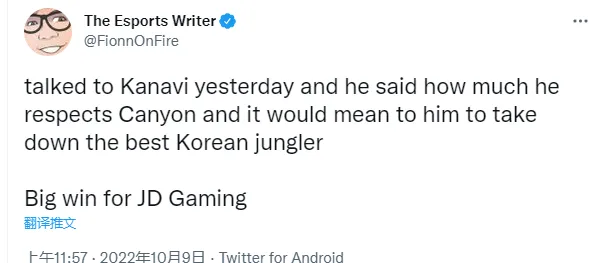 北美记者Fionn:昨天与 Kanavi交谈,他说他非常尊重Canyon,这对他来说意味着击败韩国最好的打野,JDG大获全胜!