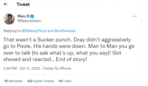 “那根本算不上一记重拳。我儿子并没有对普尔显示出很强的攻击性。他的手放了下来。这就是一个男人的正常反应(问他发生了什么事,你对我说什么)!然后他被推了,然后他就反应了一下...这就是完整的故事!”