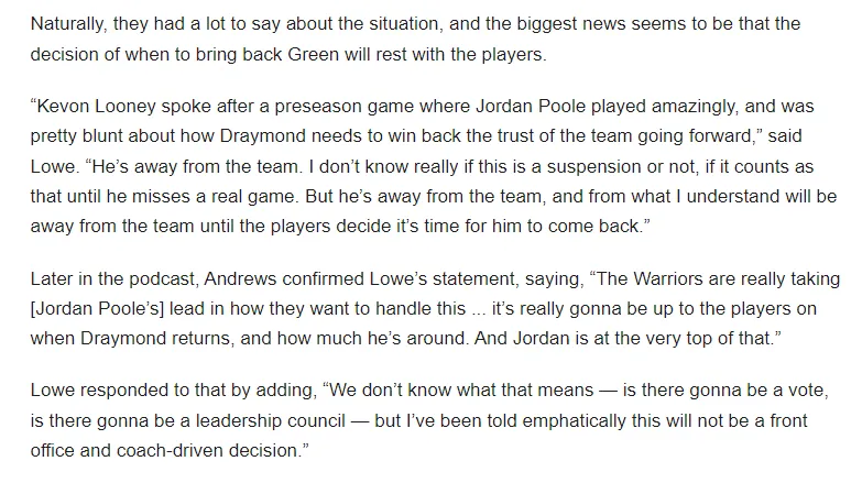 稍后Kendra Andrews也证实了Zach Lowe的言论,他说:“勇士对于这件事的处理态度,很大程度上取决于乔丹-普尔的意见。决定追梦什么时候能回归的是勇士的球员们,尤其是乔丹-普尔,他的态度最为重要。”