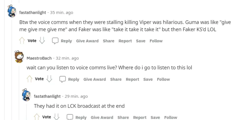 他们最后停下来击杀Viper的语音特别搞笑,Gumayusi说“你给我你给我你给我“,Faker说”你吃你吃你吃你吃“,然后自己把人头K了。