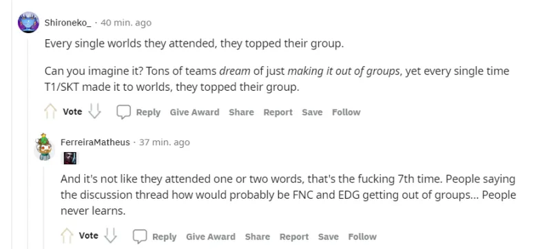 而且甚至他们不止参加了一两次世界赛,他们来了七次。这个区里的讨论贴都在说FNC和EDG能小组出线...人们总是学不会。
