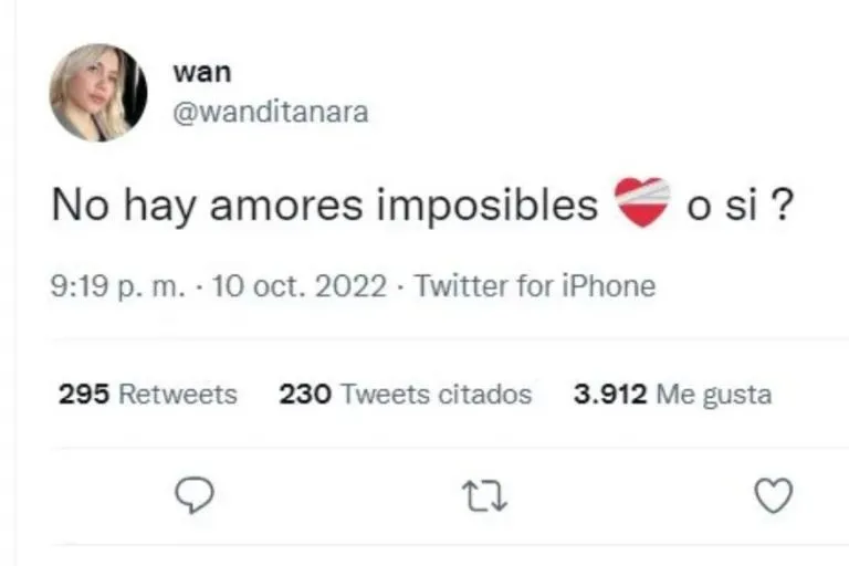 而在此条绯闻被曝出之前,旺达还在推特发布了一条信息,似乎暗示了他与阿根廷歌手之间的感情。她写到:“没有不可能的爱情,不是吗?”