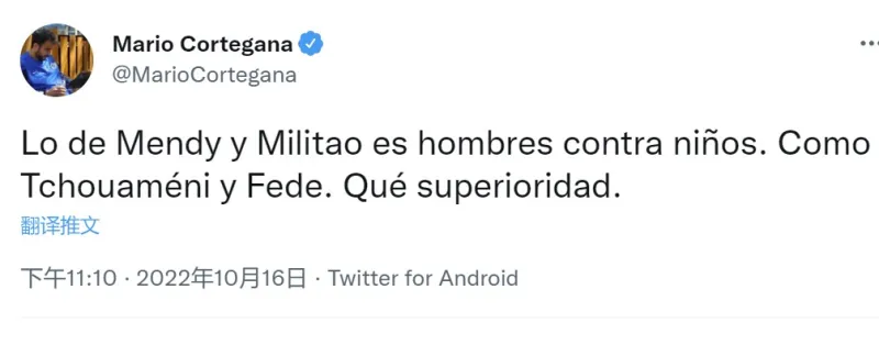 对此,《马卡报》知名记者Mario Cortegana在推特上调侃道:“门迪和米利唐就像是大人打小孩儿一样,巴尔韦德和琼阿梅尼也是这样,完全碾压了。”