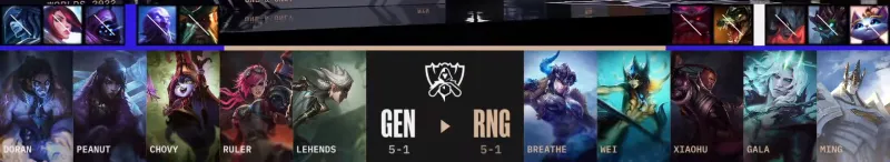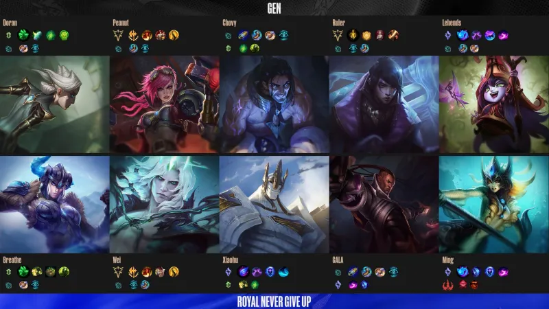 GEN选用:Doran青钢影、Peanut蔚、Chovy塞拉斯、Ruler厄斐琉斯、Lehends璐璐