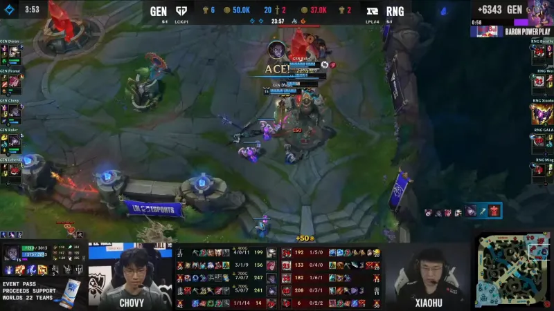 比赛第23分钟,GEN带大龙抱团推进打出1换5,Chovy三杀帮助GEN一波结束比赛。