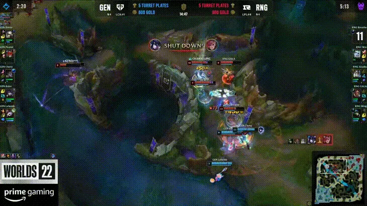 比赛第22分钟,GEN抱团拿下大龙随后回身接团打出0换5。将经济差距拉开到1w1。