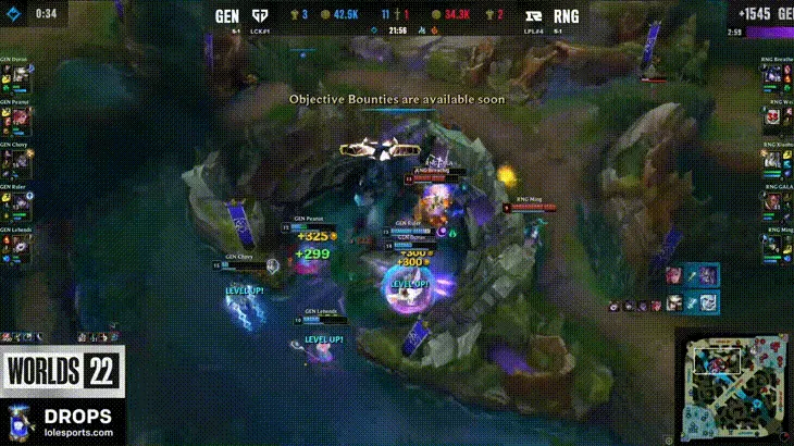 比赛第18分钟,Peanut在中路抓死GALA卢锡安后残血逃生。随后Doran青钢影配合露露大招击飞三人,继续进攻在中路打出一波0换4。