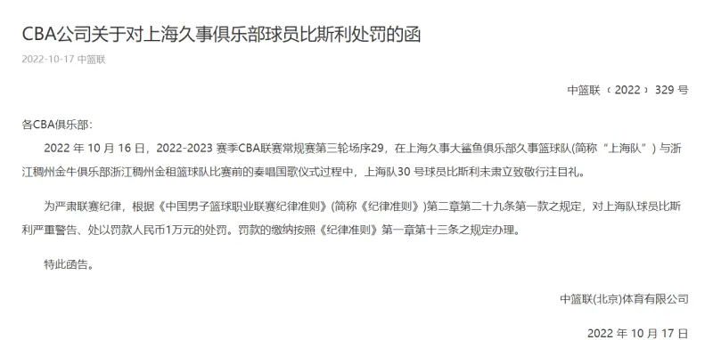 虎扑10月17日讯 CBA官方发布处罚公告,上海外援比斯利因奏国歌时没行注目礼,被严重警告并罚款1万元。