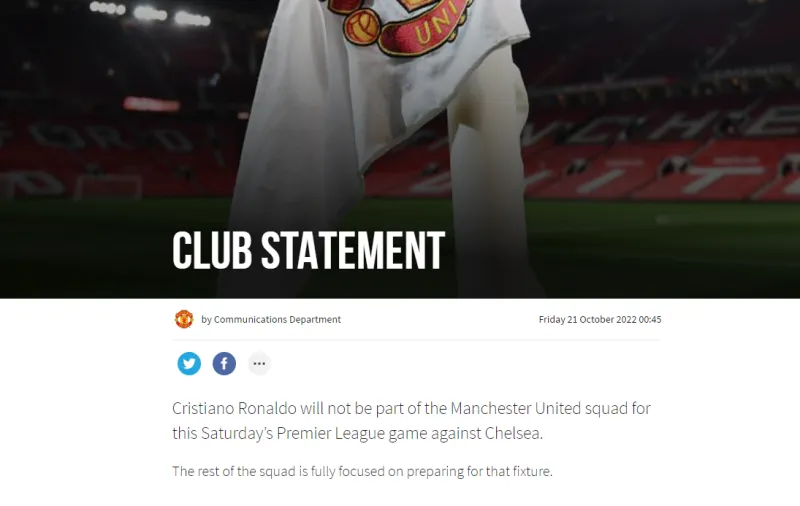 值得一提的是,曼联官推并没有发布关于C罗不会随队出征对阵切尔西的推文。