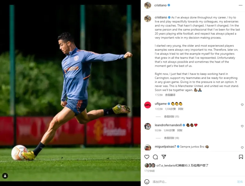 C罗写道:“就像我职业生涯一直在做的,我在努力生活并在比赛中对我的同事、对手和我的教练保持敬意,这从未改变过,我也从未改变过。我和20年前刚踢职业比赛时是一样的球员和一样的人。尊重在我做决定的过程中也一直都扮演着重要的角色。
